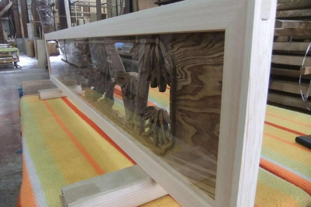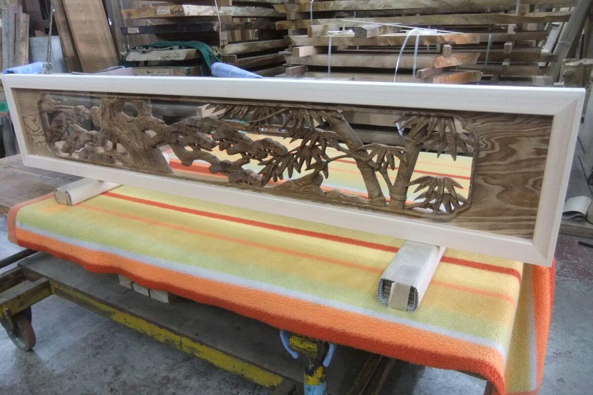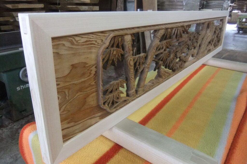 2026年2月20日 / Last updated : 2026年2月20日 梶本銘木店 彫刻欄間 透明アクリル入れ加工例 彫刻欄間にヒノキの枠を取り付けて、片面に透明アクリル板を入れた欄間を製作しました。